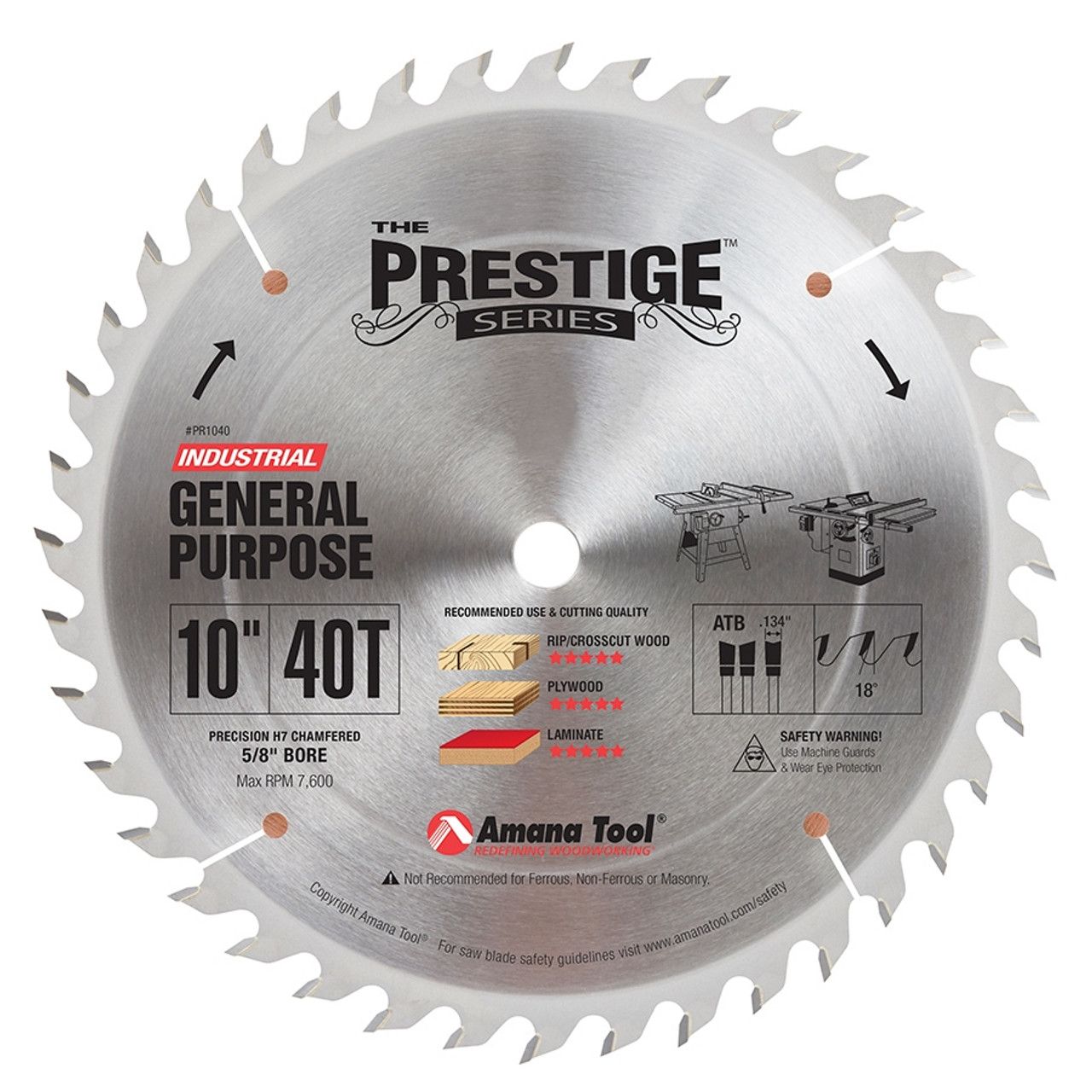 Featuring a massive tool-steel plate (.102" thick!) with expansion slots and copper plugs that practically eliminate vibration. The 40 teeth are ground with a steep 20° bevel angle, alternating left and right, for crisp, clean cuts both across and with the grain. The 18° hook angle yields an effortless feed. The precision-ground D-10 carbide teeth are individually computer-verified to have minimal run-out.