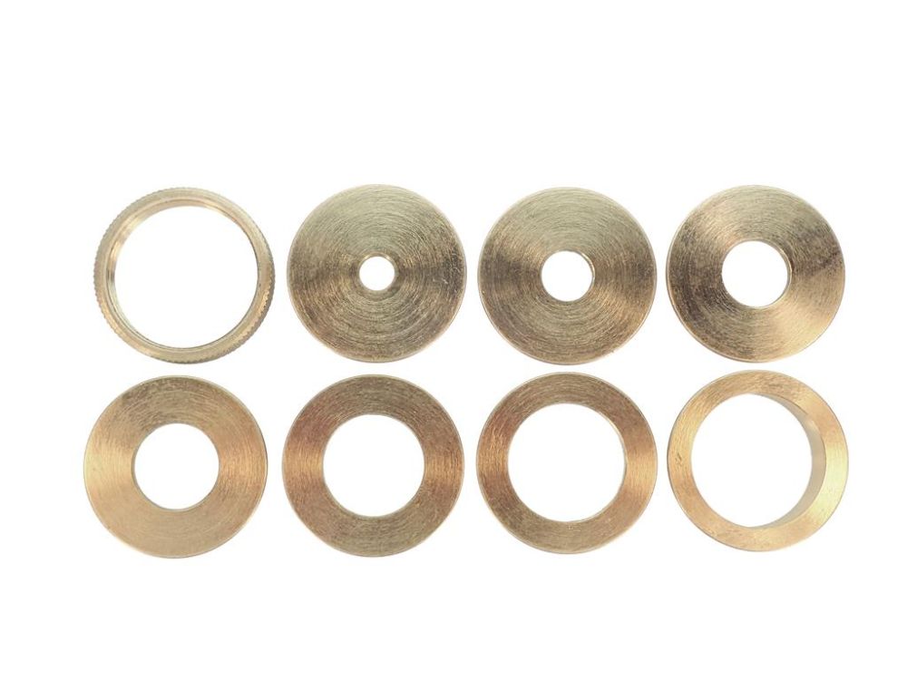 These solid brass inserts fi t into your router base plate to reduce the gap around the router bit. Not only is this safer, but it also reduces tear-out and helps support smaller work pieces. Supplied in a set with openings of 1/4”, 3/8”, 1/2”, 5/8”, 3/4”, 7/8”, and 1”, plus a retaining nut. Openings are slightly oversize for tool clearance. Fits any router with a standard 1-3/16” diameter recessed hole for template guides.